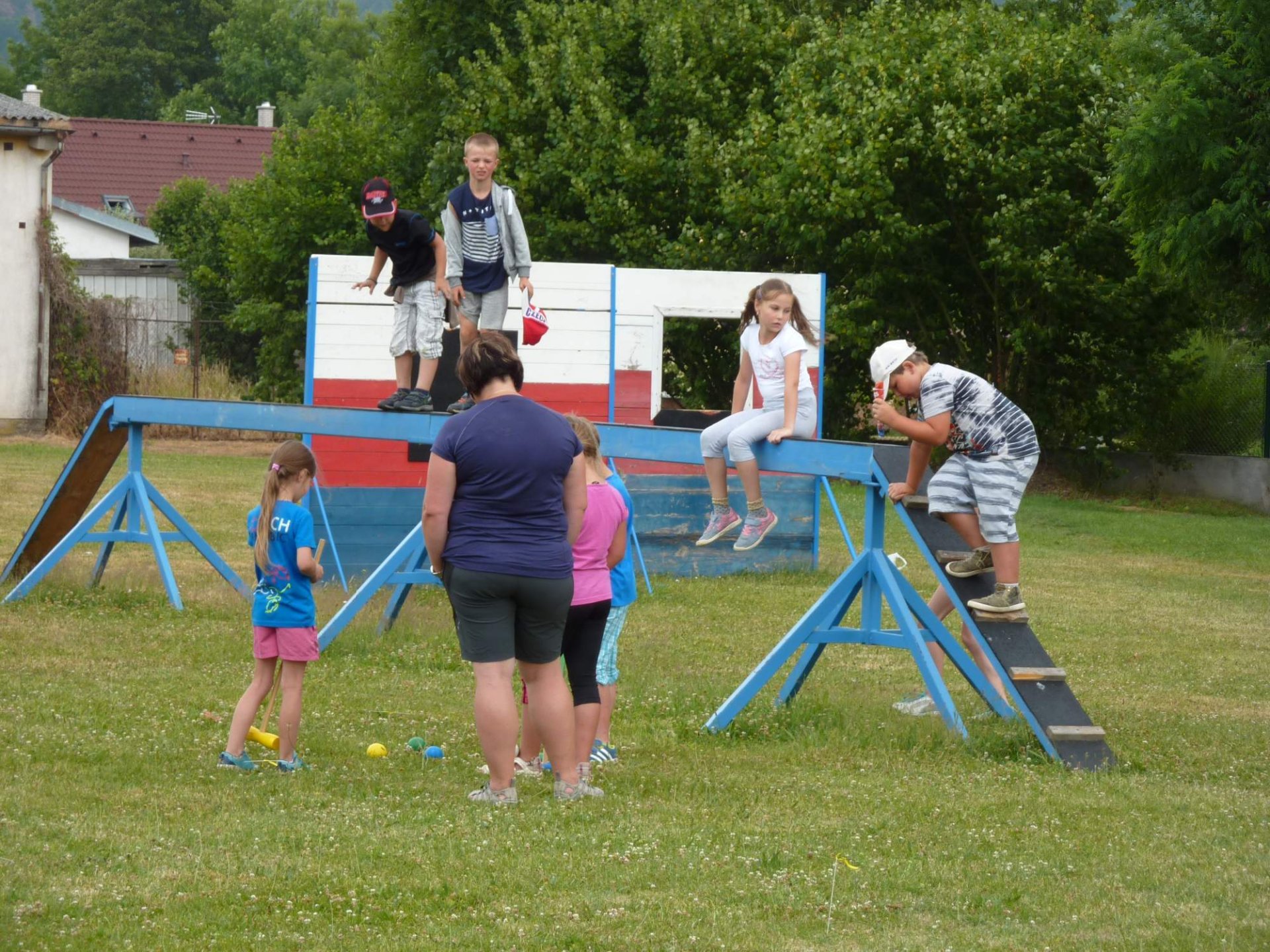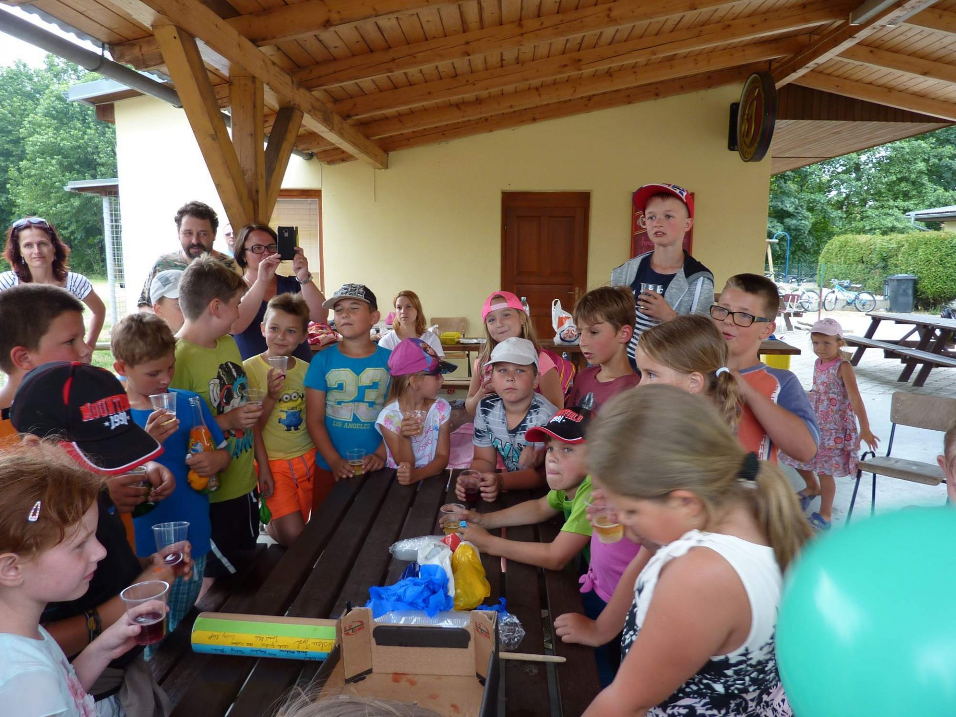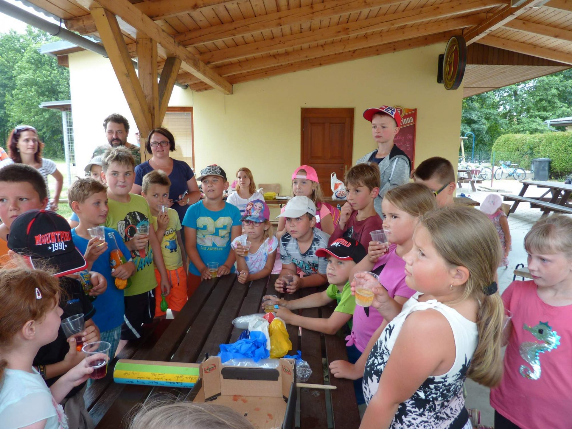 Ve 3 hodiny odpoledne se vydala skupinka tatínků znalá místního okolí připravit trasu. Za 45 minut po nich vyrazili po cestě značené fáborky nebo šipkami ostatní tatínkové nebo maminky se svými ratolestmi, aby plnili různé úkoly a bez bloudění dorazili do cíle. Podařilo se. Před pátou hodinou se obě party setkali na místním hřišti, kde si přítomní školáci připili dětským šampaňským na úspěšný konec školního roku, prvňáčci vyprávěli pohádku O třech medvědech a o zlé babce Chňapce a nakonec si všichni opekli donesené špekáčky za zvuků kytary a zpěvu trempských písní.
